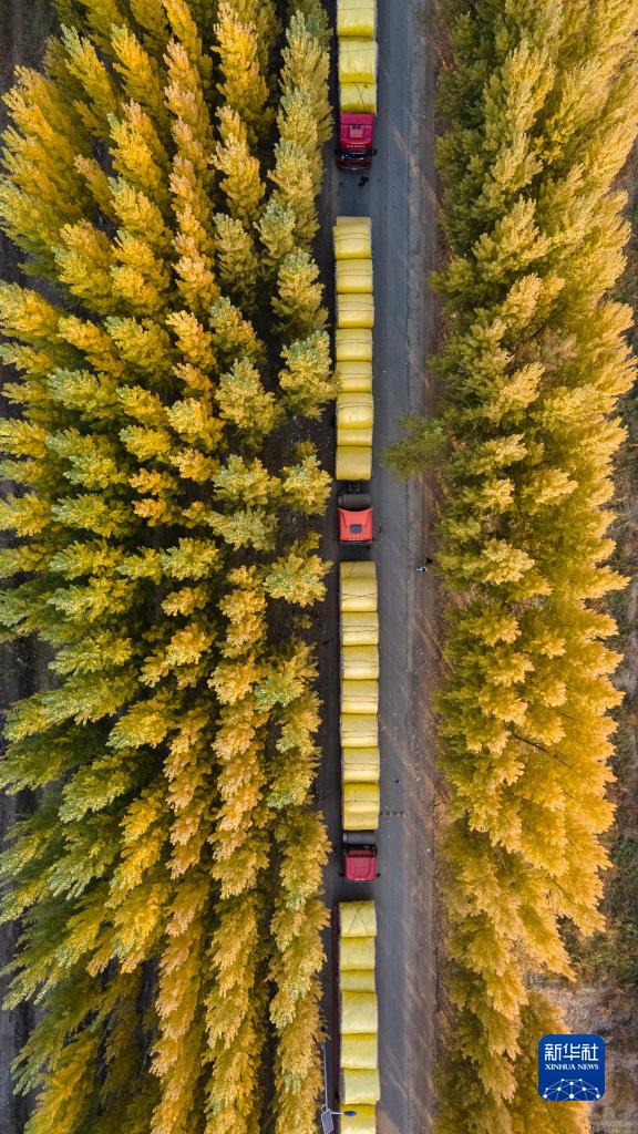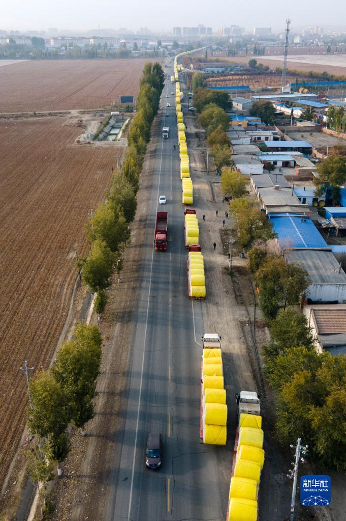 在新疆沙灣市的一家棉花收購廠外,卡車載著棉花排隊等候銷售(10月20日攝,無人機照片)。新華社記者 胡虎虎 攝