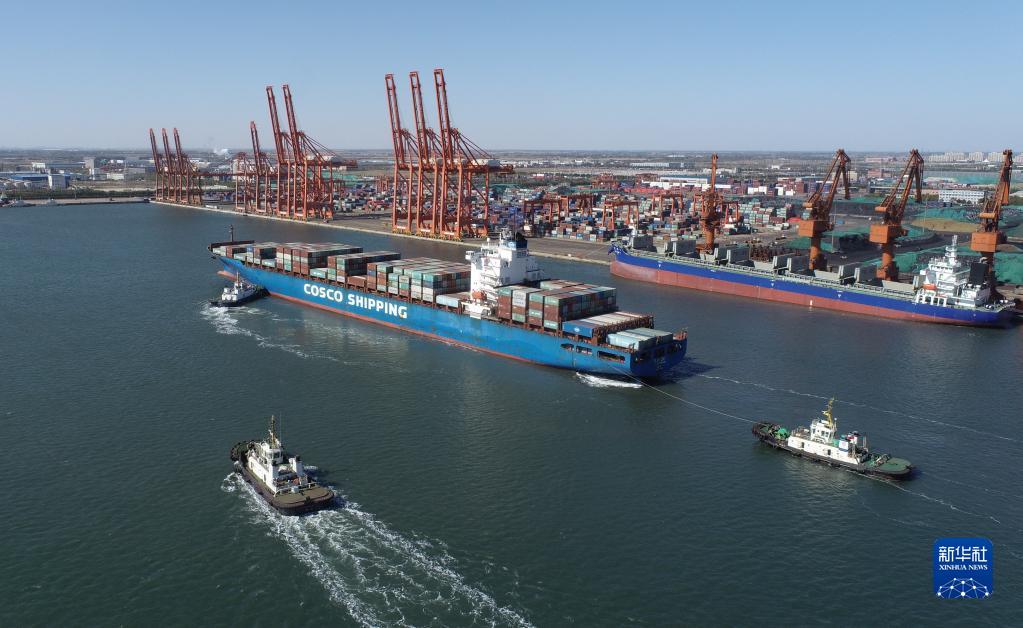 10月23日,一艘輪船向唐山港京唐港區(qū)集裝箱碼頭靠泊(無(wú)人機(jī)照片)。