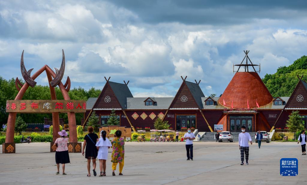 8月6日,在鄂倫春自治旗大楊樹鎮(zhèn)多布庫爾獵民村,游人們在景區(qū)觀光。