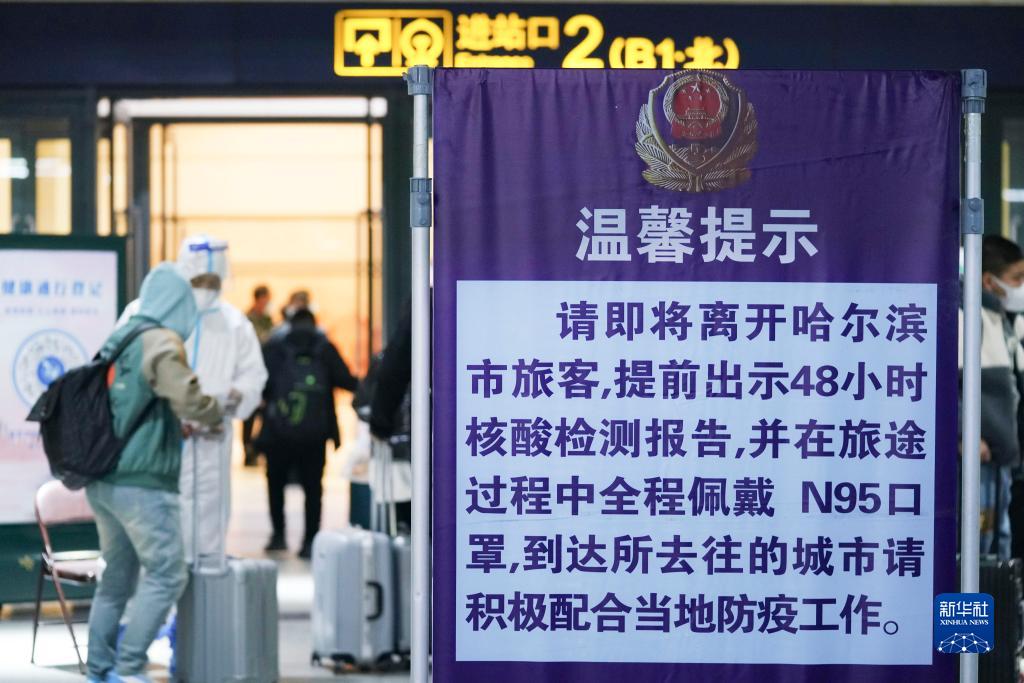 10月31日在哈爾濱火車站進站口拍攝的提示信息。 為有效快速阻斷疫情傳播渠道,哈爾濱市應對新型冠狀病毒感染肺炎疫情工作指揮部發布公告,請廣大市民群眾非必要不離哈,確需離哈的,須持48小時內核酸檢測陰性證明、憑健康碼綠碼通行,并全程做好個人防護。 新華社記者 王建威 攝