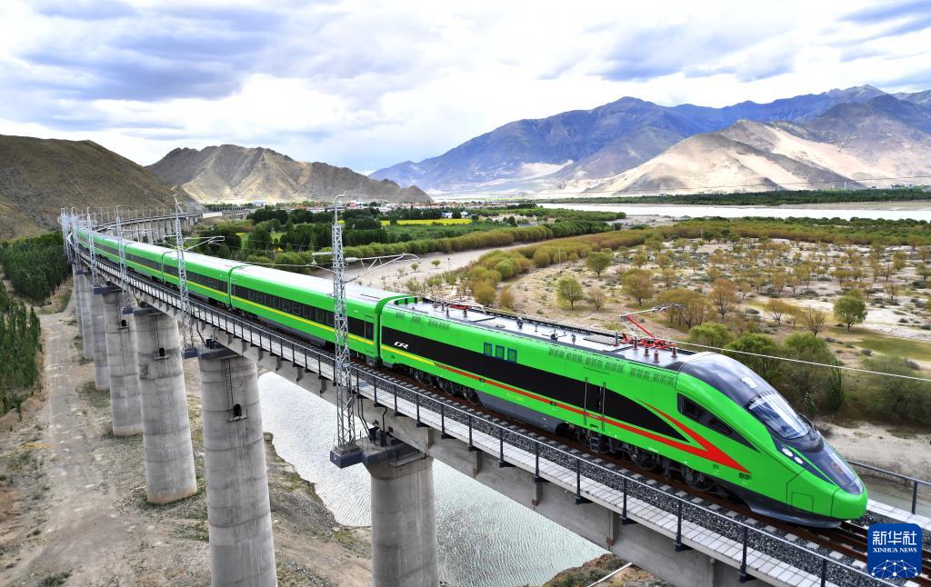 6月25日,全長435公里、設計時速160公里的拉林鐵路建成通車,西藏首條電氣化鐵路建成,同時復興號實現對31個省區市全覆蓋。這是試運行的復興號列車行駛在西藏山南市境內(6月16日攝)。新華社記者 覺果 攝