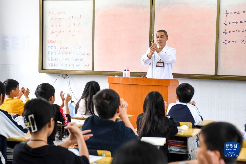 11月3日,在廣西崇左大新縣下雷鎮仁愛村,趙建柏為小學生講解七步洗手法。