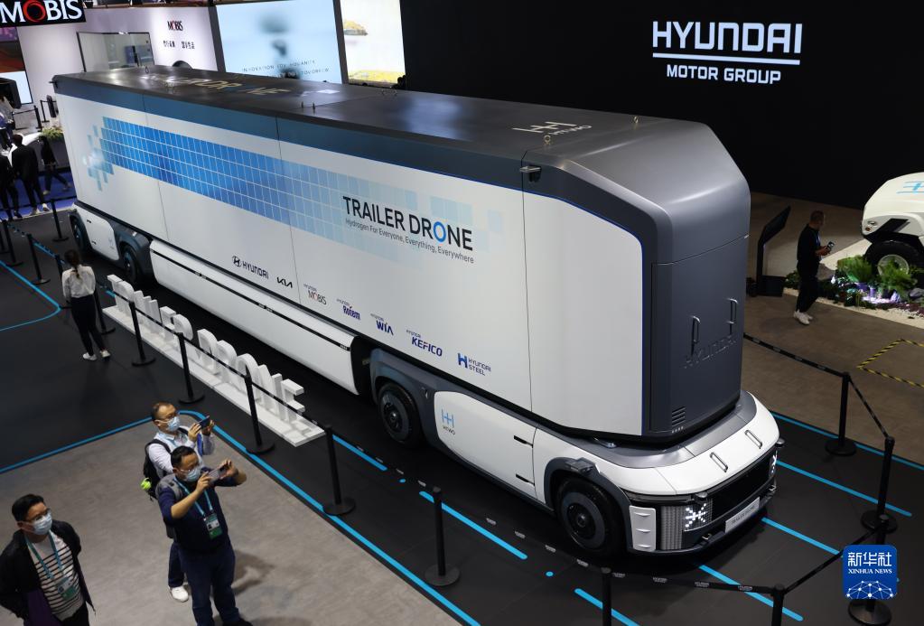 這是11月7日在進博會汽車展區現代汽車展臺拍攝的氫動智能無人運輸車。 第四屆進博會汽車展區規劃展覽面積3萬平方米,吸引了全球超過50家企業參展,展區以“綠色、創新、科技引領”為辦展主線,全面展示世界汽車工業的最新發展成果及未來愿景。 新華社記者 侯東濤 攝