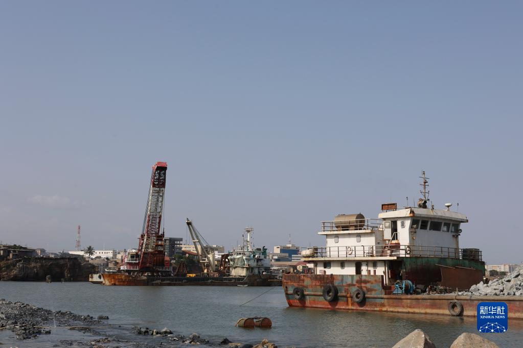 11月4日,在加納首都阿克拉,船只在中國援建加納漁港綜合設施項目施工現場作業。