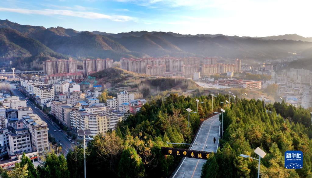 11月9日拍攝的鹿城公園(無人機(jī)照片)。 陜西省商洛市商南縣是秦嶺深處的一個(gè)山區(qū)小縣,過去縣城發(fā)展相對(duì)落后,隨著城市建設(shè)快速推進(jìn),如今市容市貌有了很大提升,配以山川、河流、樹木等自然景觀,繪成一幅美麗畫卷。 新華社記者 陶明 攝