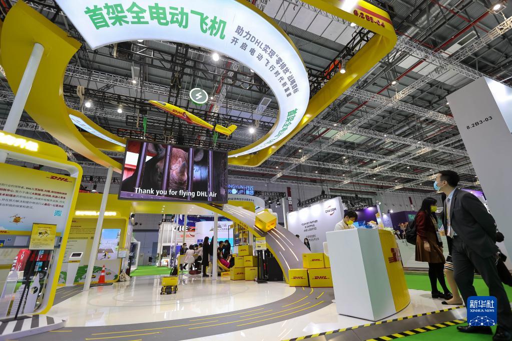 11月8日在第四屆進博會服務貿易展區拍攝的DHL展臺。 進博會上的服務貿易展區許多展品“看不見”,卻又“含金量”頗高。第四屆中國國際進口博覽會服務貿易展區,迎來50多個國家和地區的300多家企業參展,涵蓋金融咨詢、物流航運、文化旅游等領域,助推全球服務貿易“再升級”。 新華社記者 王翔 攝