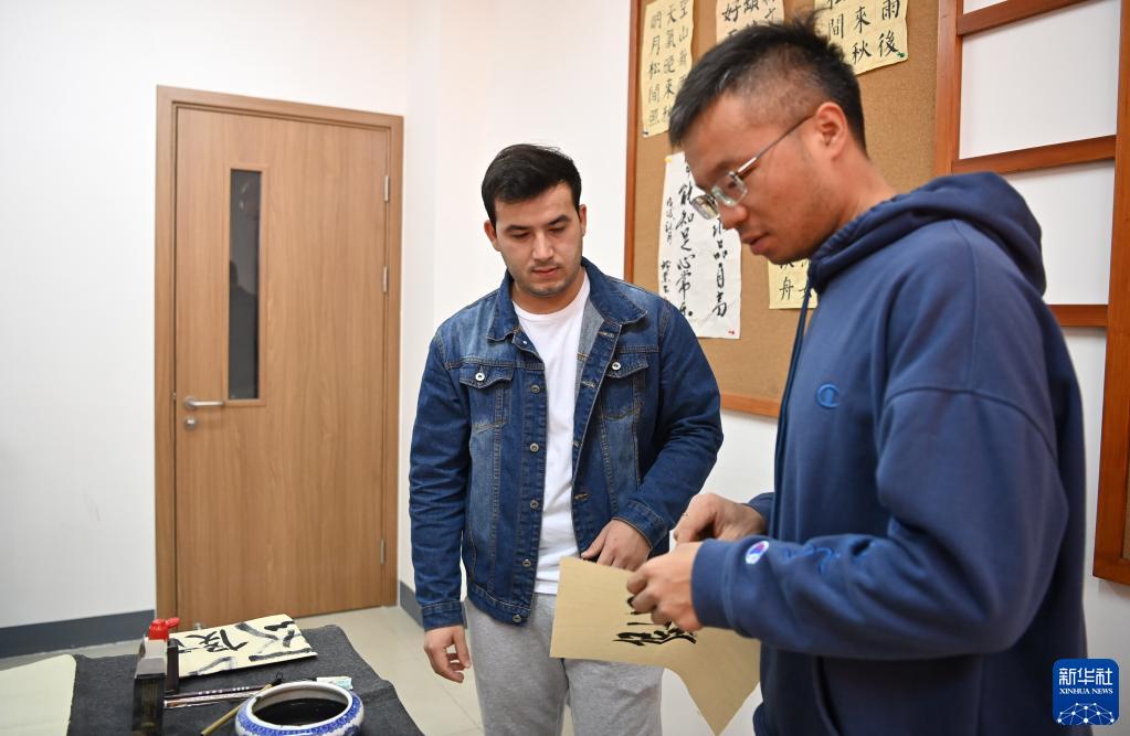 在南開大學的一間書法教室內,侯子墨(左)向老師請教宣紙的折紙方法(11月15日攝)。 “你知道嗎?我連說夢話都是在講漢語,這還是上回去丹東時,一個俄羅斯的室友告訴我的?!焙钭幽谥械倪@件趣事令人有些難以置信,但當他用流暢的漢語侃侃而談時,又讓人覺得這在情理之中。 今年24歲的侯子墨來自塔吉克斯坦,是天津南開大學漢語言文化學院國際教育專業2021級碩士生。前不久,他還在2021“甲骨文杯”國際學生“我與漢字”演講大賽中獲得冠軍。 “小時候我特別喜歡看中國的功夫電影,人們飛來飛去覺得特別神奇。”在那時,他和中國的情緣便已埋下了種子。 2016年,還在塔吉克斯坦國立民族大學讀書的侯子墨因為學習孔子學院的課程,加上他的中文老師是一位書法愛好者,而徹底喜歡上了漢語和漢字。 2017年,侯子墨參加了第十六屆“漢語橋”世界大學生中文比賽,并獲得了塔吉克斯坦賽區的亞軍。之后,他便選擇出國留學來到大連外國語大學學習中文,今年9月,侯子墨順利考入南開大學攻讀碩士學位。 侯子墨對學習中文十分癡迷,他學唱中國流行歌曲、參加演講比賽,還練習書法、研究漢字的偏旁部首。談到未來,侯子墨說:“我的目標就是在研究生階段進一步提升中文水平,學成之后回到祖國成為一名大學的中文教師?!?/span> 新華社記者 李然 攝 |