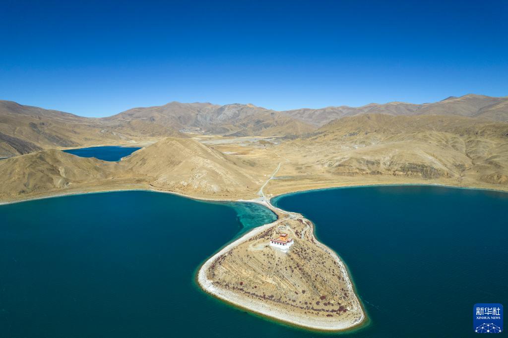 這是11月16日拍攝的羊卓雍措和坐落在湖畔的日托寺(無人機照片)。 羊卓雍措簡稱羊湖,大部分位于西藏山南市浪卡子縣境內,湖面海拔4400多米。近年來,羊卓雍措周邊生態環境持續向好,棲息繁衍的野生動物數量逐年增多。 新華社記者 孫瑞博 攝