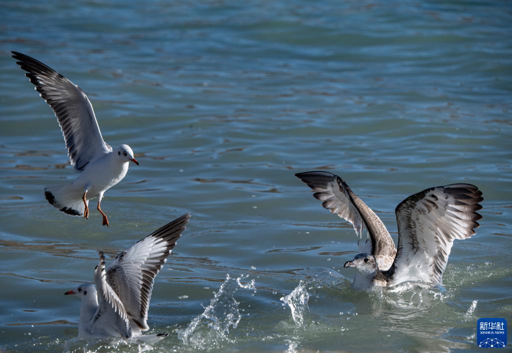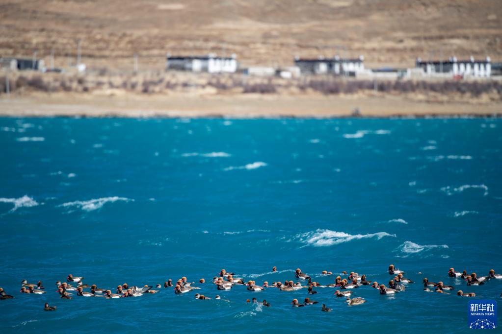 鳥兒在羊卓雍措湖面上游弋(11月16日攝)。 羊卓雍措簡稱羊湖,大部分位于西藏山南市浪卡子縣境內,湖面海拔4400多米。近年來,羊卓雍措周邊生態環境持續向好,棲息繁衍的野生動物數量逐年增多。 新華社記者 孫非 攝