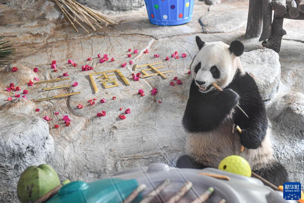 當日,為慶祝大熊貓“貢貢”和“舜舜”來到海南三周年,位于海口的海南熱帶野生動植物園為這對熊貓兄弟準備了新玩具和竹筍、水果、胡蘿卜等美食,并組織“熊貓粉”對大熊貓進行網絡視頻直播。