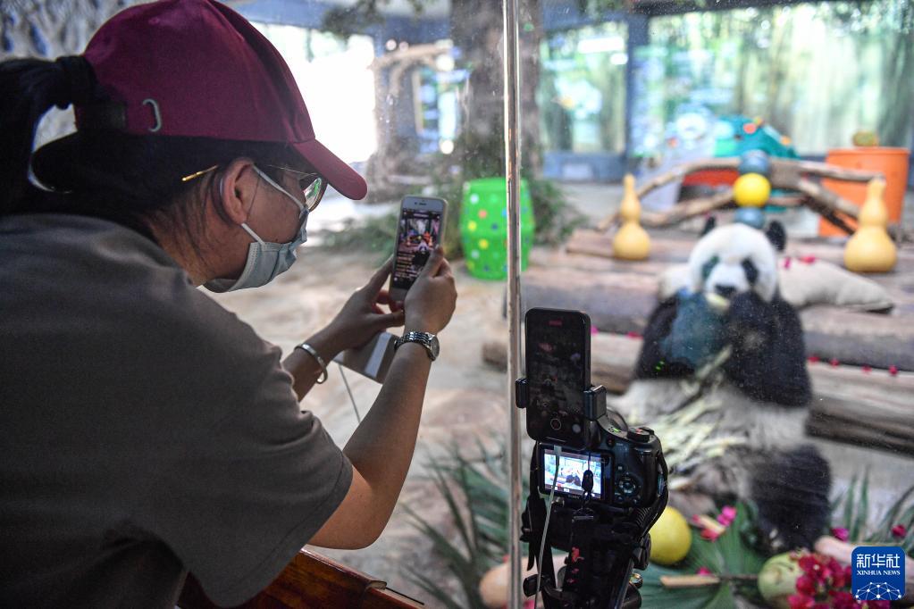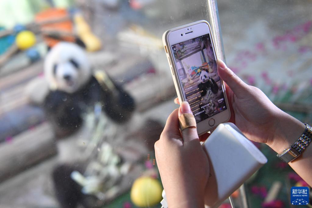 11月21日,在位于海口的海南熱帶野生動植物園,一名“熊貓粉”對大熊貓進行網絡視頻直播。 當日,為慶祝大熊貓“貢貢”和“舜舜”來到海南三周年,位于海口的海南熱帶野生動植物園為這對熊貓兄弟準備了新玩具和竹筍、水果、胡蘿卜等美食,并組織“熊貓粉”對大熊貓進行網絡視頻直播。 新華社記者 蒲曉旭 攝