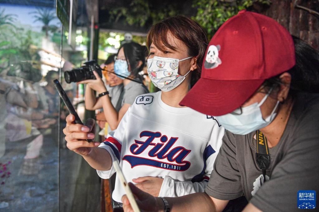 11月21日,在位于海口的海南熱帶野生動植物園,觀眾們在拍攝大熊貓。 當日,為慶祝大熊貓“貢貢”和“舜舜”來到海南三周年,位于海口的海南熱帶野生動植物園為這對熊貓兄弟準備了新玩具和竹筍、水果、胡蘿卜等美食,并組織“熊貓粉”對大熊貓進行網絡視頻直播。 新華社記者 蒲曉旭 攝