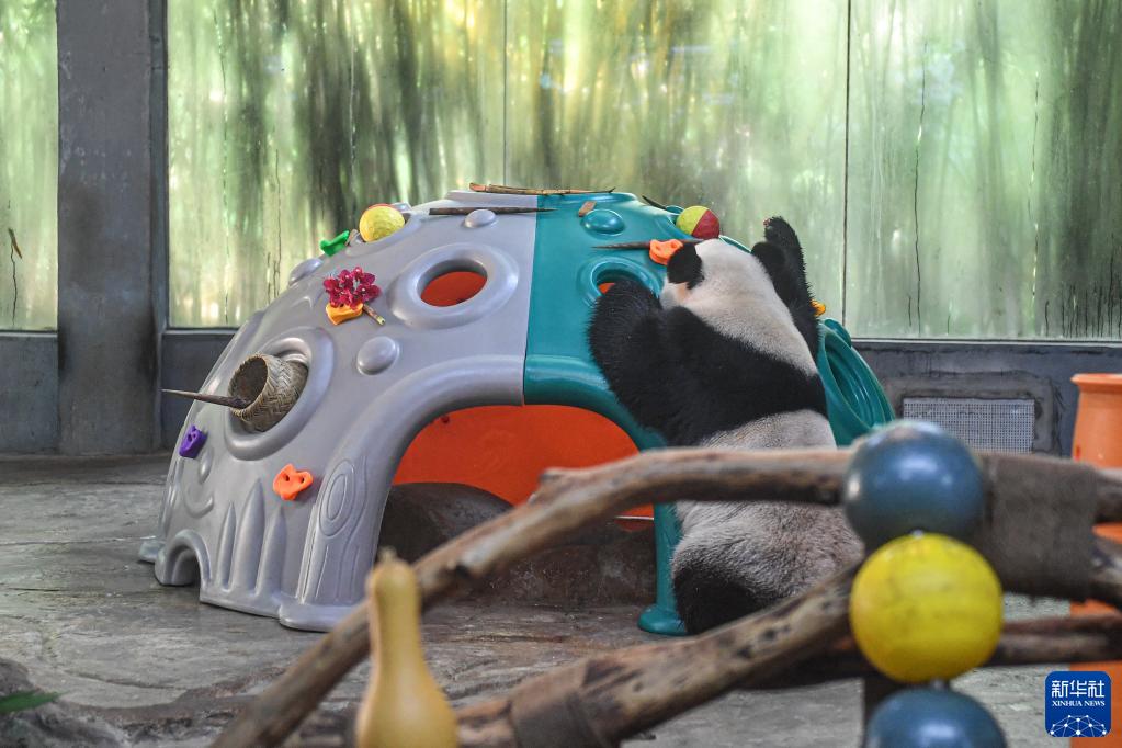 11月21日,在位于海口的海南熱帶野生動植物園,大熊貓“貢貢”在玩新玩具。 當日,為慶祝大熊貓“貢貢”和“舜舜”來到海南三周年,位于海口的海南熱帶野生動植物園為這對熊貓兄弟準備了新玩具和竹筍、水果、胡蘿卜等美食,并組織“熊貓粉”對大熊貓進行網絡視頻直播。 新華社記者 蒲曉旭 攝