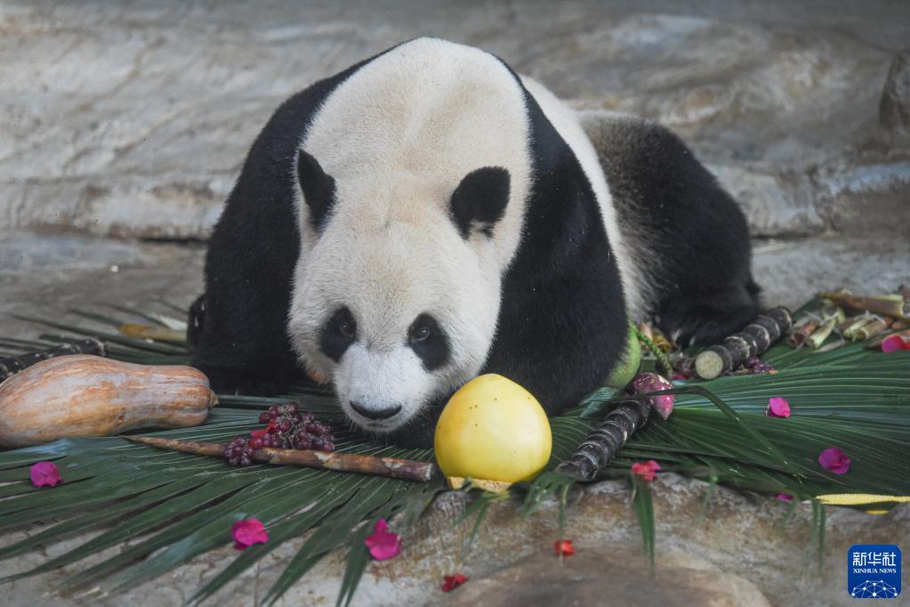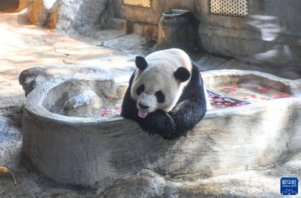 11月21日,在位于海口的海南熱帶野生動植物園,大熊貓“舜舜”享受“花瓣浴”。 當日,為慶祝大熊貓“貢貢”和“舜舜”來到海南三周年,位于海口的海南熱帶野生動植物園為這對熊貓兄弟準備了新玩具和竹筍、水果、胡蘿卜等美食,并組織“熊貓粉”對大熊貓進行網絡視頻直播。 新華社記者 蒲曉旭 攝