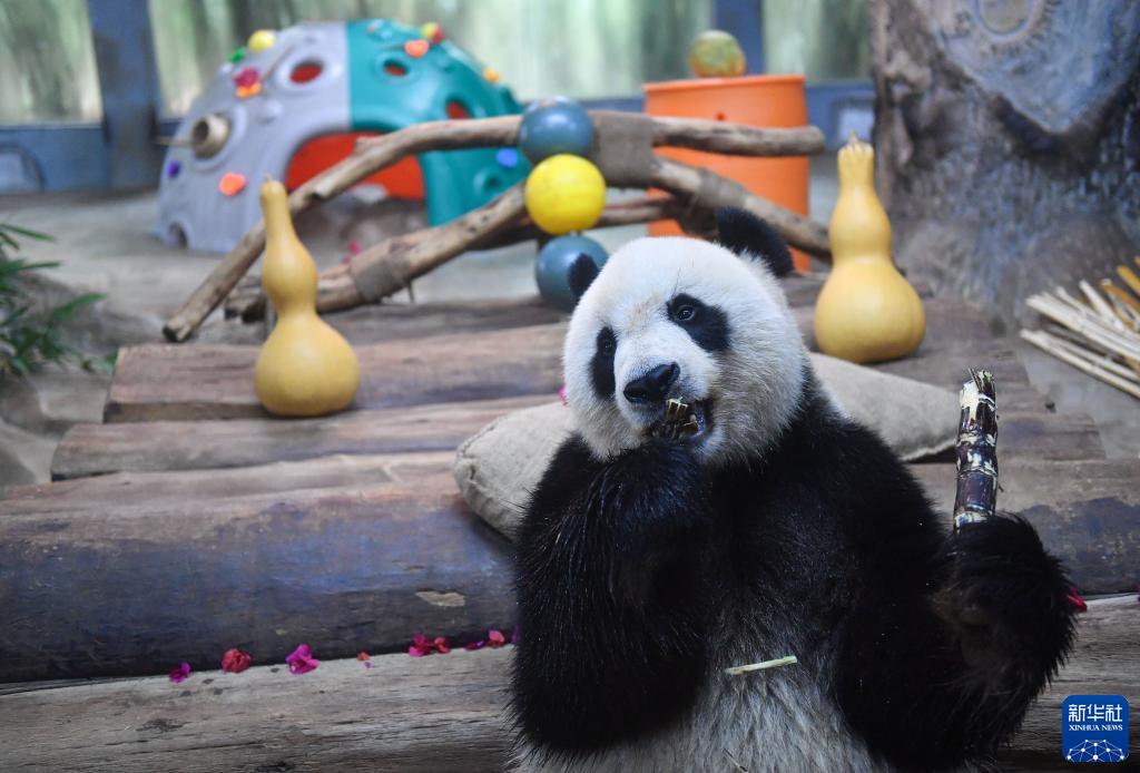 11月21日,在位于海口的海南熱帶野生動植物園,大熊貓“貢貢”享用美食。 當日,為慶祝大熊貓“貢貢”和“舜舜”來到海南三周年,位于海口的海南熱帶野生動植物園為這對熊貓兄弟準備了新玩具和竹筍、水果、胡蘿卜等美食,并組織“熊貓粉”對大熊貓進行網絡視頻直播。 新華社記者 蒲曉旭 攝