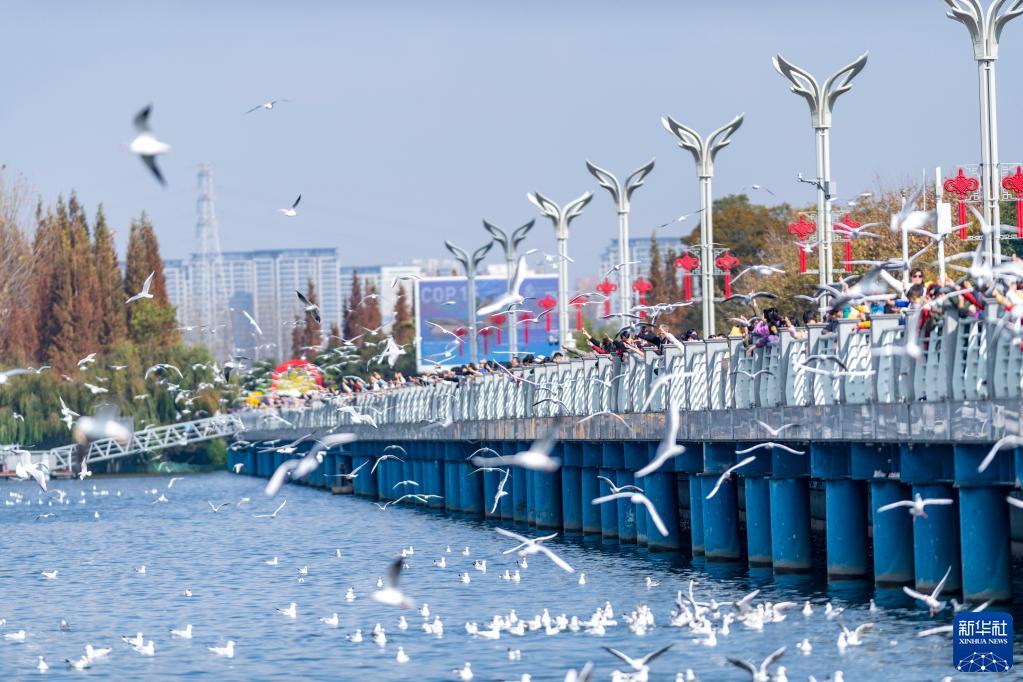 11月21日,游客在海埂大壩上投喂紅嘴鷗。