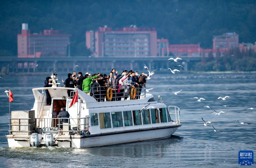 當日,春城昆明天氣晴好。在滇池海埂大壩,成群的紅嘴鷗時而盤旋、時而嬉戲。