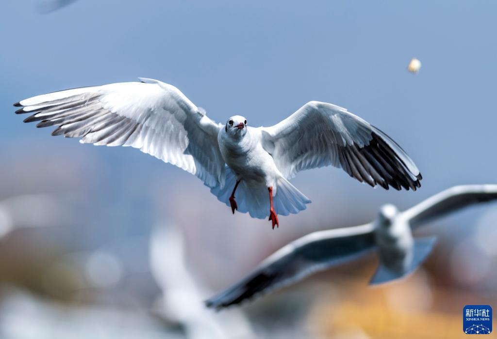 當(dāng)日,春城昆明天氣晴好。在滇池海埂大壩,成群的紅嘴鷗時而盤旋、時而嬉戲。