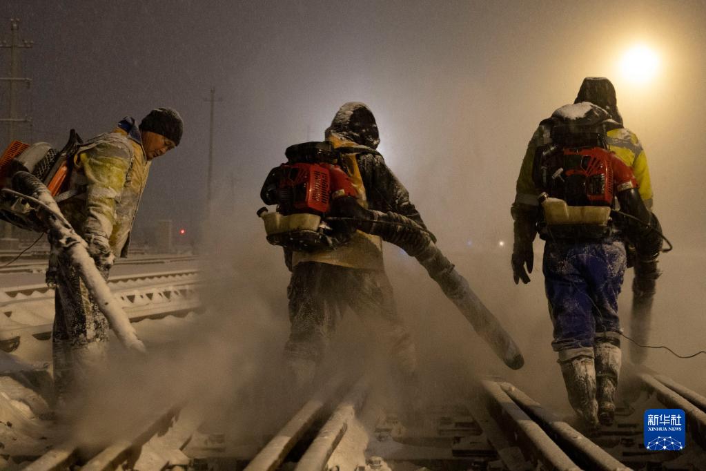 11月22日凌晨,在雞西站西場,工作人員進行清雪作業。 黑龍江省雞西市氣象局于11月22日03時50分將暴雪橙色預警信號升級為暴雪紅色預警信號。為保障當地物資運輸暢通、居民出行便利,雞西市相關部門迅速組織除雪力量,一夜無眠的“逆行者”在暴雪中用自己的辛苦付出,保障城市有序運轉和居民正常生活。 新華社記者 張濤 攝