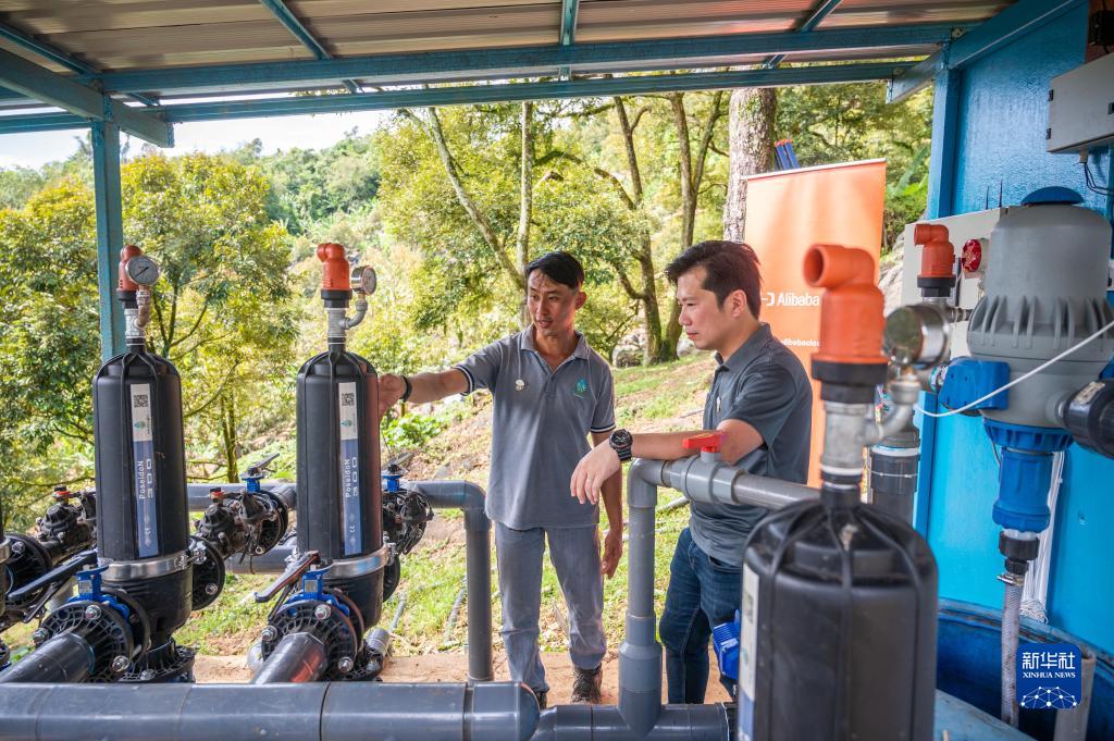 11月21日,在馬來西亞“貓山王”榴蓮產(chǎn)地彭亨州勞勿,經(jīng)營榴蓮種植園的梁沛鑫(左)與馬來西亞歷佳德有限公司總經(jīng)理莊愷靖在榴蓮云物聯(lián)網(wǎng)水肥系統(tǒng)旁交談。 新華社記者 朱煒 攝