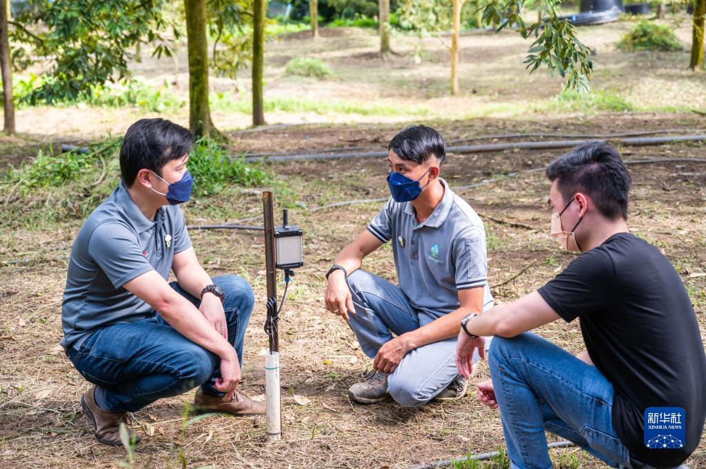 11月21日,在馬來西亞“貓山王”榴蓮產(chǎn)地彭亨州勞勿,經(jīng)營榴蓮種植園的梁沛鑫(中)與馬來西亞歷佳德有限公司總經(jīng)理莊愷靖(左)及阿里云工作人員曹國廷在榴蓮?fù)寥纻鞲衅髋越徽劇?/p> 新華社記者 朱煒 攝 |