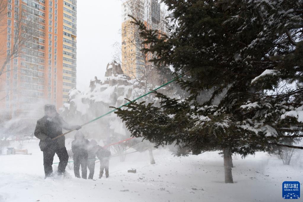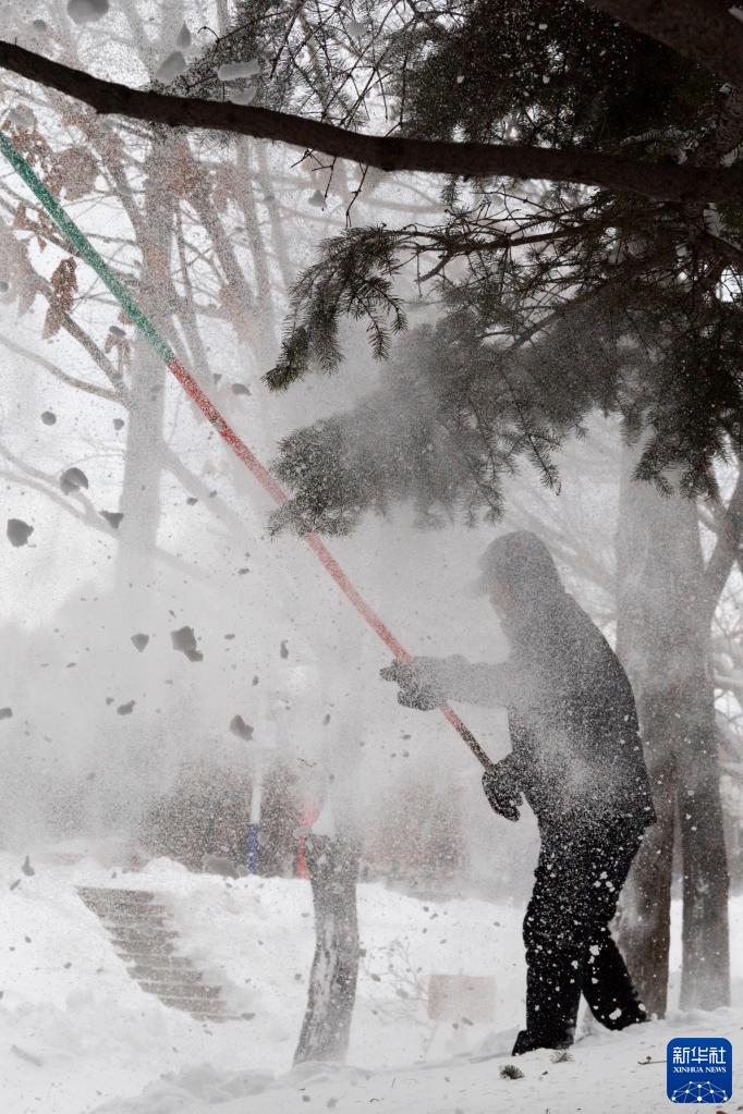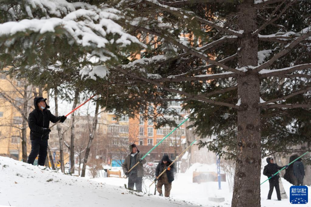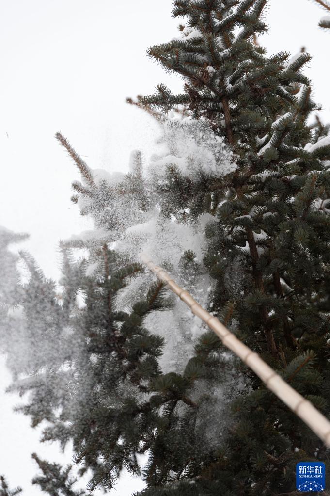 11月23日,在鶴崗市振興廣場(chǎng),園林工人用長竹竿清理針葉樹樹冠積雪。 日前,黑龍江省鶴崗市迎來新一輪強(qiáng)降雪天氣。為防止城區(qū)針葉樹因樹冠掛冰雪導(dǎo)致樹枝折斷、樹木倒伏等問題,鶴崗市城市管理綜合執(zhí)法局園林中心提前準(zhǔn)備6米長竹竿60根,就近存放各廣場(chǎng),同時(shí)為各區(qū)配備打雪員、司機(jī)、裝卸工共計(jì)100人,配備清雪運(yùn)輸翻斗車、吊車等車輛16輛,及時(shí)對(duì)城區(qū)主次干道兩側(cè)樹木的樹冠積雪進(jìn)行清理,保證市民出行安全。 新華社記者 謝劍飛 攝