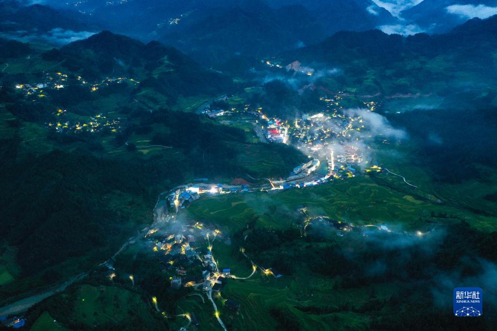 這是廣西融水苗族自治縣桿洞鄉桿洞村夜景(無人機照片,8月27日攝)。