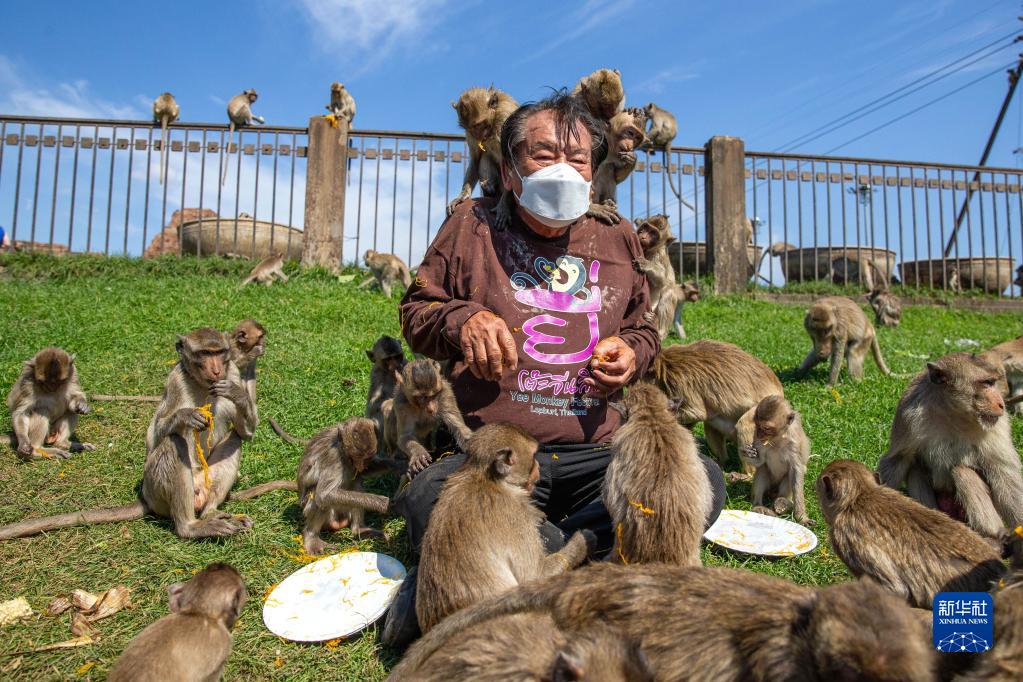 11月28日,工作人員在泰國華富里給猴子喂食。 當日,有泰國“猴城”之稱的華富里舉辦一年一度的“猴子自助餐節(jié)”,人們?yōu)楹镒犹峁┧惋嬃?感謝它們吸引游客前來。 新華社記者 王騰 攝