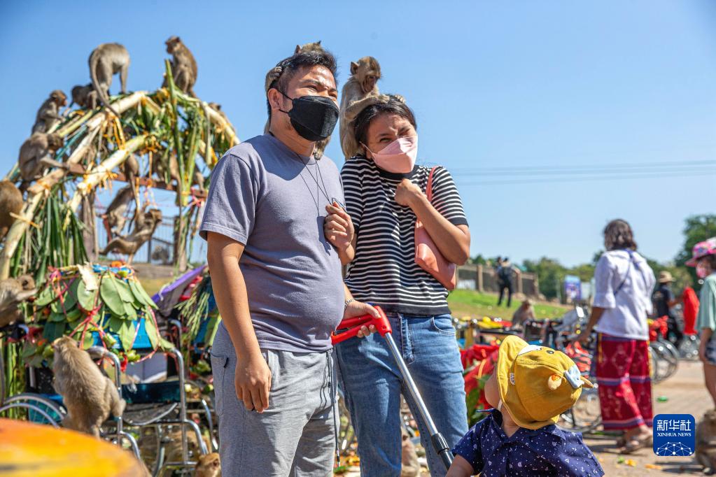 11月28日,游客在泰國華富里與猴子合照。 當日,有泰國“猴城”之稱的華富里舉辦一年一度的“猴子自助餐節(jié)”,人們?yōu)楹镒犹峁┧惋嬃?感謝它們吸引游客前來。 新華社記者 王騰 攝 |
