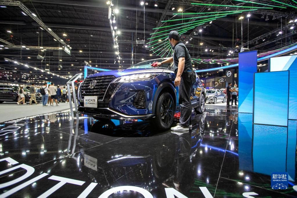 12月1日,工作人員在泰國曼谷舉行的第38屆泰國國際車展上清潔展車。 當日,第38屆泰國國際車展開幕。共有32家國際汽車品牌、12家摩托車品牌及眾多零配件廠商參展,該展覽將持續至12月12日。新華社記者 王騰 攝