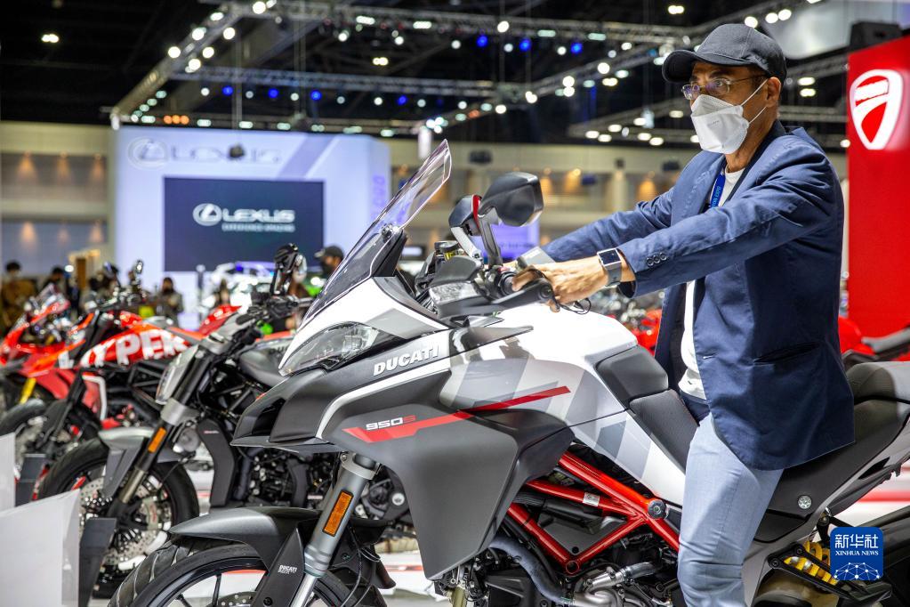 12月1日,一名男子在泰國曼谷舉行的第38屆泰國國際車展上試騎摩托車。 當日,第38屆泰國國際車展開幕。共有32家國際汽車品牌、12家摩托車品牌及眾多零配件廠商參展,該展覽將持續至12月12日。新華社記者 王騰 攝
