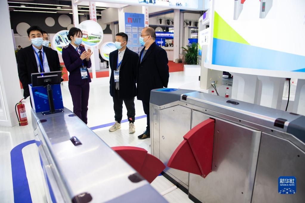 12月8日,在2021中國國際軌道交通和裝備制造產業博覽會上,工作人員(左二)向觀眾介紹地鐵邊門閘機。