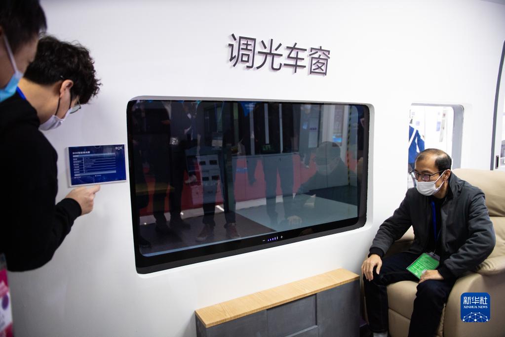 12月8日,在2021中國國際軌道交通和裝備制造產業博覽會上,觀眾(右)在觀看京東方展臺上的調光車窗。