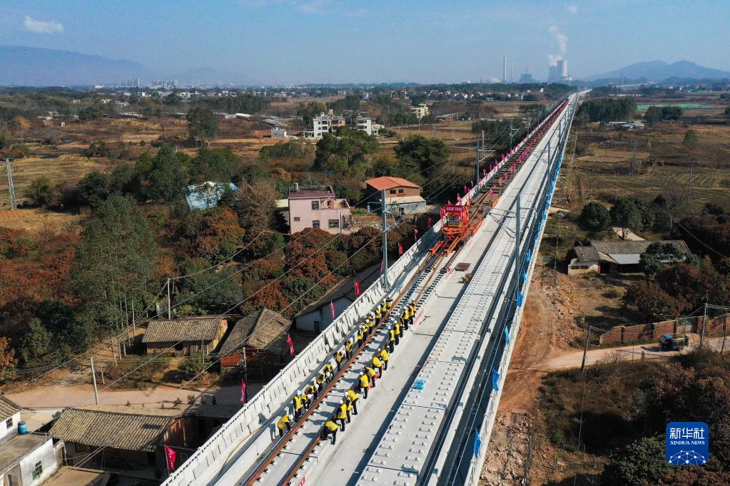 2月1日,中鐵四局建設者在贛深高鐵汕湛高速特大橋無砟軌道上準備鋪設首條鐵軌(無人機照片)。新華社記者 劉大偉 攝
