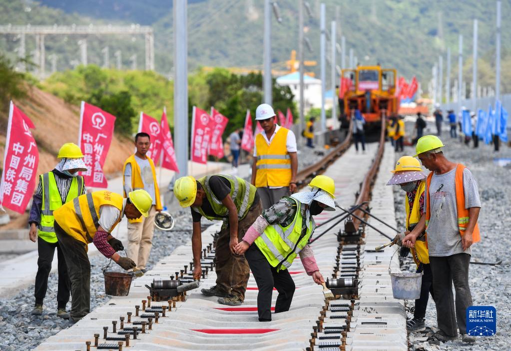 5月27日,中鐵四局施工人員在深圳北站外鋪設贛深鐵路廣東段南端大里程方向最后一對長軌。新華社記者 劉大偉 攝