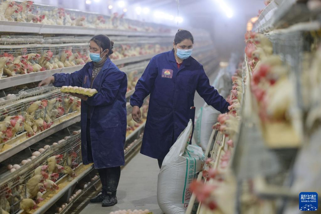 在新疆莎車縣戈壁產業園家禽養殖基地,工人在雞舍里收雞蛋(12月12日攝)。 地處塔克拉瑪干沙漠西南緣的莎車縣是新疆人口第一大縣,也是2020年新疆最后10個脫貧縣之一,茫茫戈壁曾是當地經濟發展的瓶頸。 2021年,莎車縣為解決人多地少、就近就業問題,充分利用戈壁光照資源,在寸草不生的戈壁灘上規劃建設了2萬畝的戈壁產業園。據當地政府統計,莎車縣戈壁產業園已建成3000座溫室大棚、15萬只肉羊良種繁育中心、200萬只家禽養殖基地等。周邊四個鄉鎮的近3000名村民就近就業,村民通過承包大棚、務工就業等形式實現穩定增收。 新華社記者 丁磊 攝