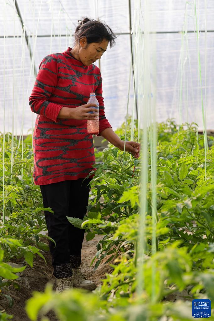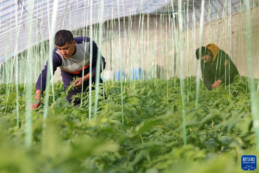 在新疆莎車縣戈壁產業園,農戶在溫室大棚給西紅柿輔助授粉(12月12日攝)。 地處塔克拉瑪干沙漠西南緣的莎車縣是新疆人口第一大縣,也是2020年新疆最后10個脫貧縣之一,茫茫戈壁曾是當地經濟發展的瓶頸。 2021年,莎車縣為解決人多地少、就近就業問題,充分利用戈壁光照資源,在寸草不生的戈壁灘上規劃建設了2萬畝的戈壁產業園。據當地政府統計,莎車縣戈壁產業園已建成3000座溫室大棚、15萬只肉羊良種繁育中心、200萬只家禽養殖基地等。周邊四個鄉鎮的近3000名村民就近就業,村民通過承包大棚、務工就業等形式實現穩定增收。 新華社記者 丁磊 攝