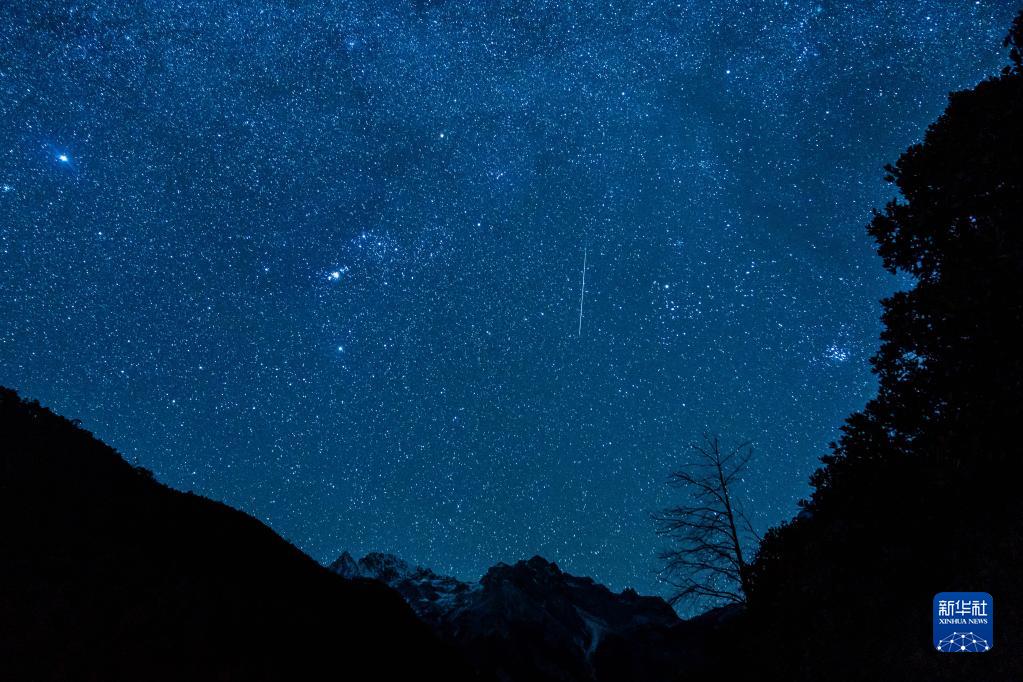 12月14日凌晨在云南省麗江市玉龍雪山腳下拍攝的雙子座流星雨。