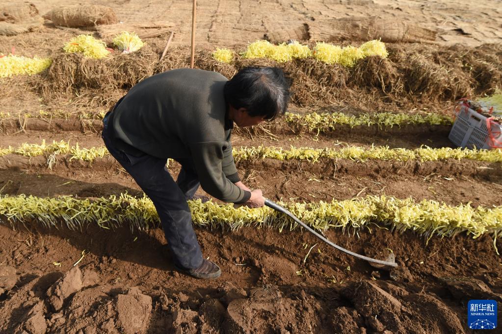 12月15日,在蘭州市西固區張家大坪村,農民在收割韭黃。