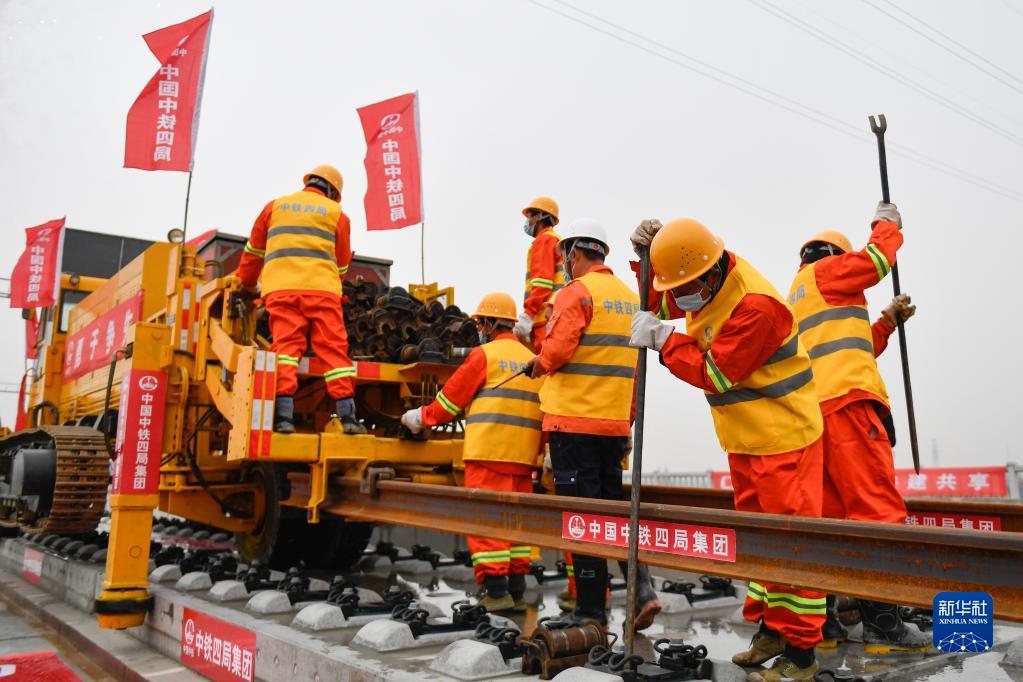 12月16日,中鐵四局施工人員在湖杭鐵路上進行鋪軌作業。