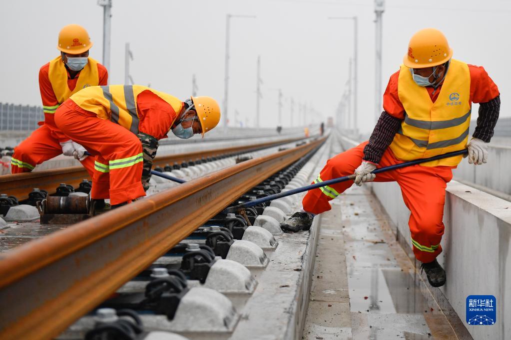 12月16日,中鐵四局施工人員在湖杭鐵路上進行鋪軌作業。