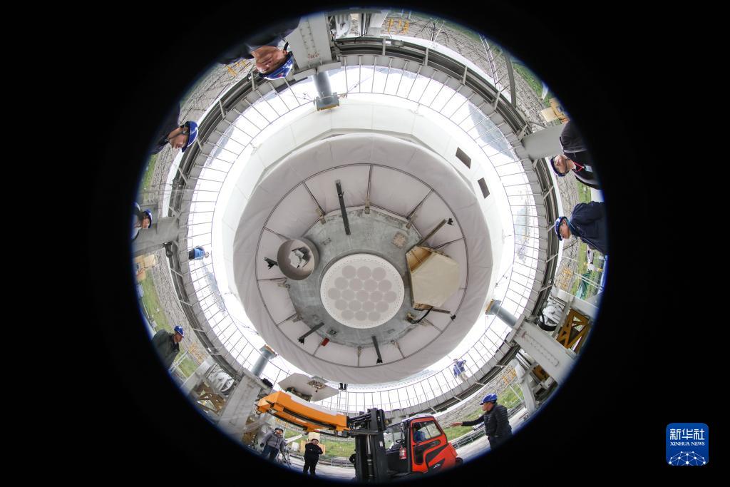 12月17日,工作人員在“中國(guó)天眼”的饋源艙前(維護(hù)保養(yǎng)期間攝)。