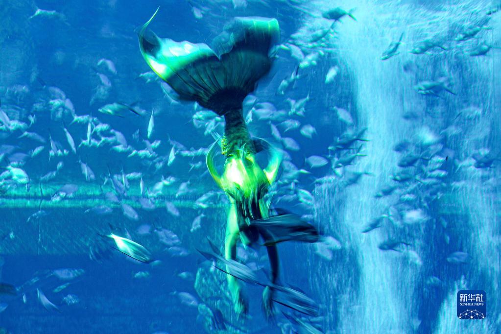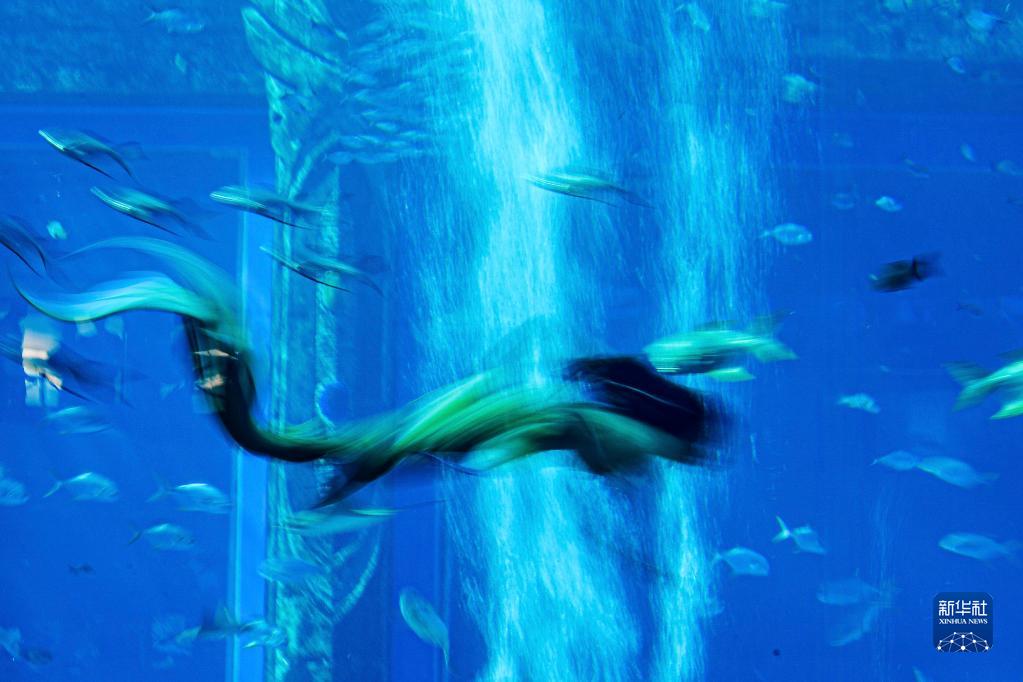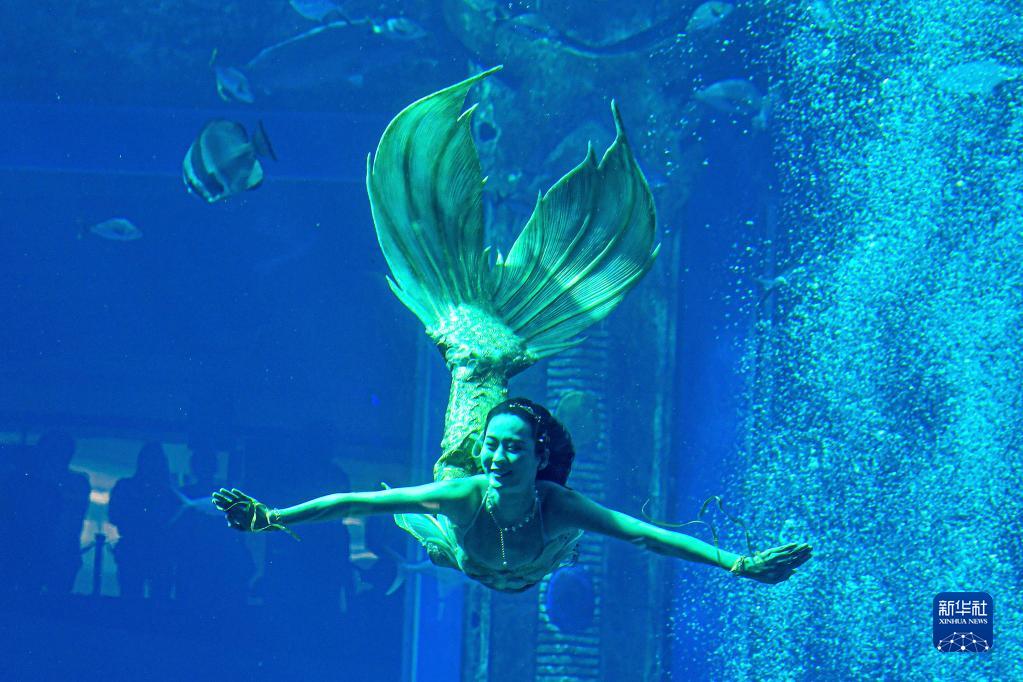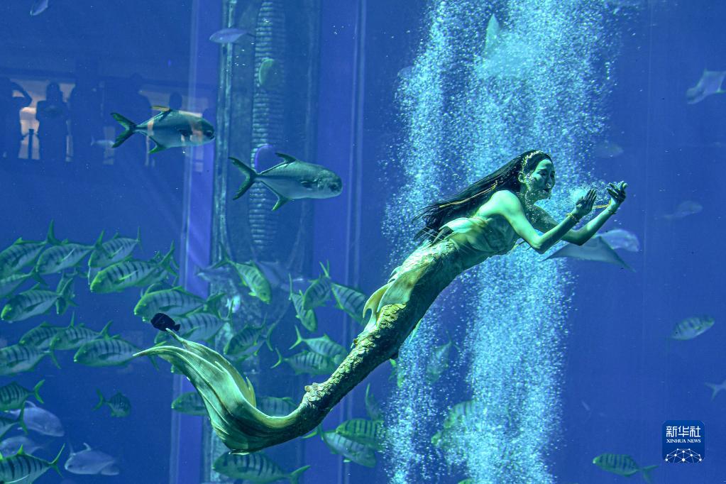 12月22日,首屆中國美人魚表演賽參賽選手在比賽中。 當日,由國家體育總局水上運動管理中心等單位主辦的首屆中國美人魚表演賽在海南三亞亞特蘭蒂斯舉行決賽。 新華社記者 蒲曉旭 攝