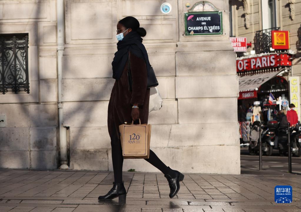 12月23日,在法國巴黎香榭麗舍大街,一名女子拎著剛剛選購的商品。