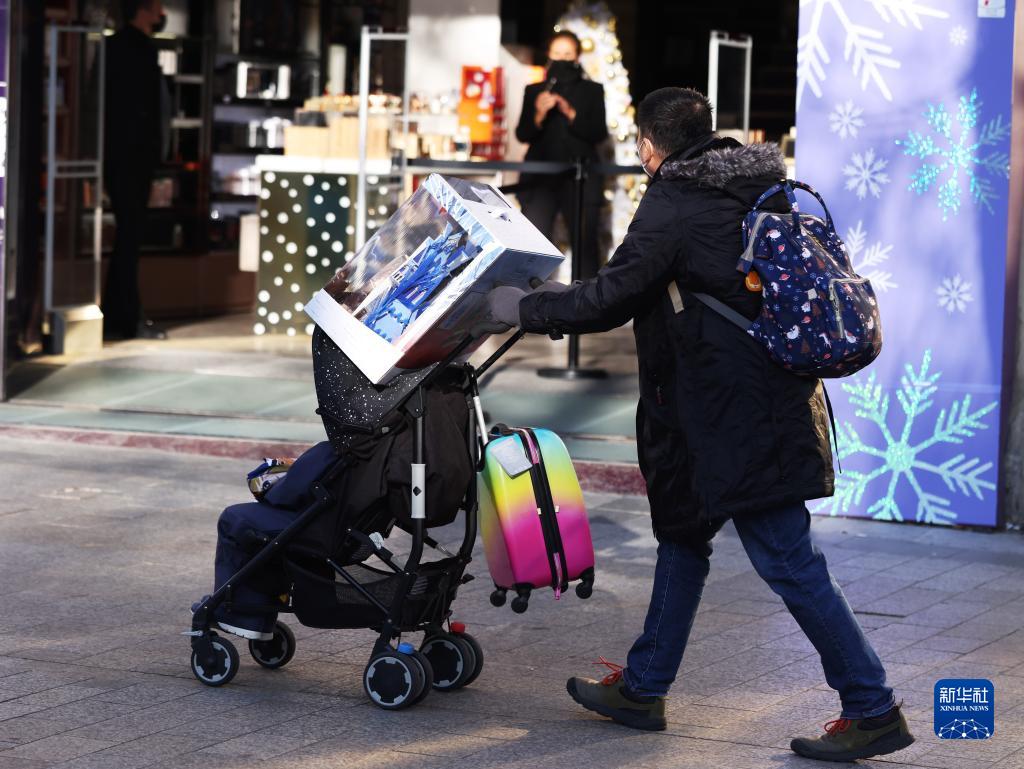 12月23日,在法國巴黎香榭麗舍大街,一名男子用童車推著剛選購的商品。