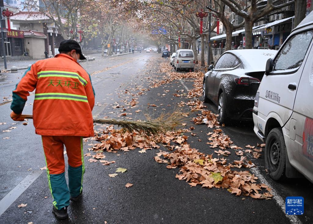 12月25日,環衛工人在空闊的西安市建設路上清掃衛生。 當日,西安市迎來雨雪天氣,全市小區(村)、單位實行封閉化管理,隨處可見堅守在各小區出入口的工作人員。雖然疫情讓這座城市按下暫停鍵,但是人們的生活仍在繼續:核酸檢測按時按規有序進行,一線工作者盡心盡力為民服務,所有市民按規居家抗疫,糧、油、肉、菜、蛋、奶等11類生活必需品市場供應充足,公共區域環境消殺頻次增加,整座城市安靜有序。 新華社記者 陶明 攝