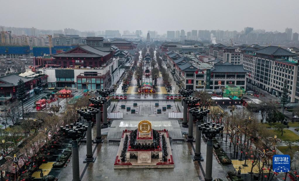 12月25日,封閉后的西安市大唐不夜城一片寧靜(無人機照片)。 當日,西安市迎來雨雪天氣,全市小區(村)、單位實行封閉化管理,隨處可見堅守在各小區出入口的工作人員。雖然疫情讓這座城市按下暫停鍵,但是人們的生活仍在繼續:核酸檢測按時按規有序進行,一線工作者盡心盡力為民服務,所有市民按規居家抗疫,糧、油、肉、菜、蛋、奶等11類生活必需品市場供應充足,公共區域環境消殺頻次增加,整座城市安靜有序。 新華社記者 陶明 攝