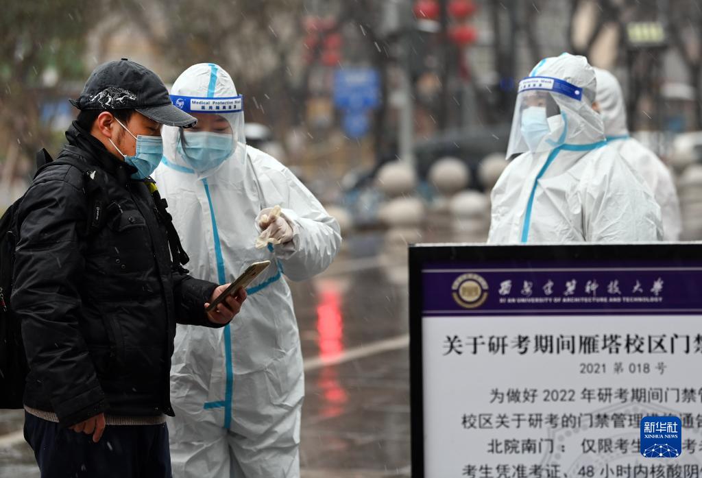 12月25日,防疫人員查看研考生(左一)的核酸檢測結果。當日在西安市參加考試的考生約13.5萬人,他們將在各方保駕護航下,帶著希望與夢想奔赴各考點。 當日,西安市迎來雨雪天氣,全市小區(村)、單位實行封閉化管理,隨處可見堅守在各小區出入口的工作人員。雖然疫情讓這座城市按下暫停鍵,但是人們的生活仍在繼續:核酸檢測按時按規有序進行,一線工作者盡心盡力為民服務,所有市民按規居家抗疫,糧、油、肉、菜、蛋、奶等11類生活必需品市場供應充足,公共區域環境消殺頻次增加,整座城市安靜有序。 新華社記者 陶明 攝