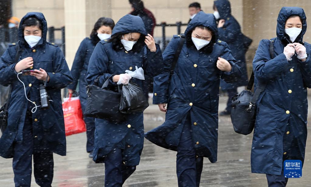 冒著風雪上班的鐵路員工(12月25日攝)。 當日,西安市迎來雨雪天氣,全市小區(村)、單位實行封閉化管理,隨處可見堅守在各小區出入口的工作人員。雖然疫情讓這座城市按下暫停鍵,但是人們的生活仍在繼續:核酸檢測按時按規有序進行,一線工作者盡心盡力為民服務,所有市民按規居家抗疫,糧、油、肉、菜、蛋、奶等11類生活必需品市場供應充足,公共區域環境消殺頻次增加,整座城市安靜有序。 新華社記者 陶明 攝