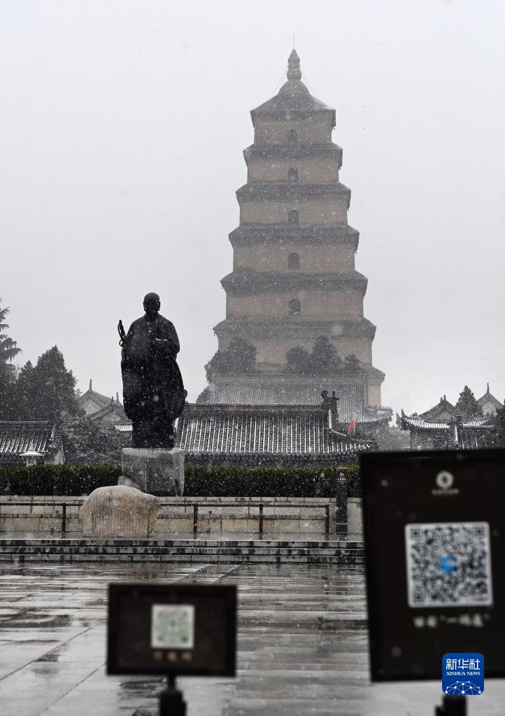 空曠的西安市大雁塔南廣場(12月25日攝)。 當日,西安市迎來雨雪天氣,全市小區(村)、單位實行封閉化管理,隨處可見堅守在各小區出入口的工作人員。雖然疫情讓這座城市按下暫停鍵,但是人們的生活仍在繼續:核酸檢測按時按規有序進行,一線工作者盡心盡力為民服務,所有市民按規居家抗疫,糧、油、肉、菜、蛋、奶等11類生活必需品市場供應充足,公共區域環境消殺頻次增加,整座城市安靜有序。 新華社記者 陶明 攝
